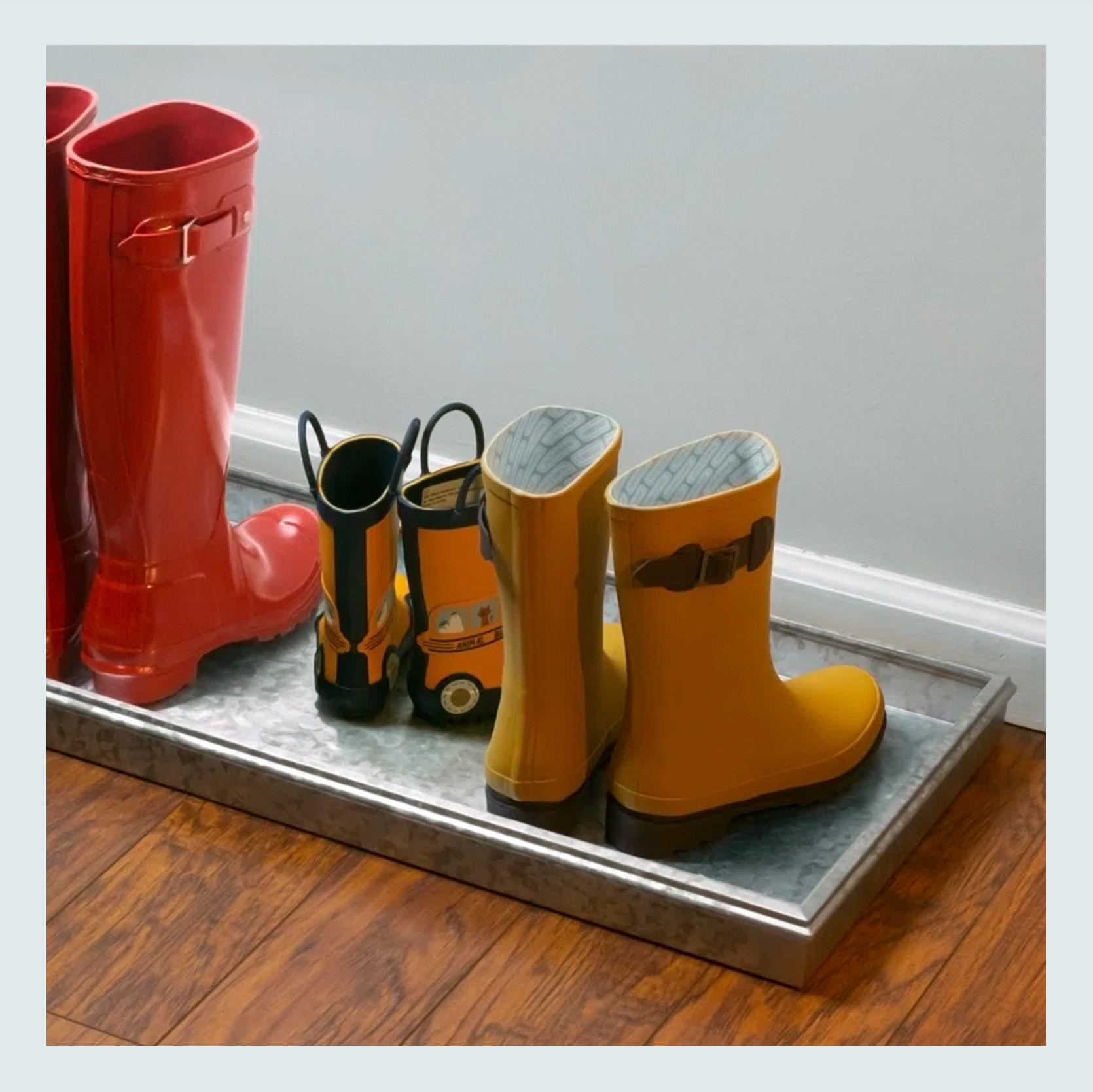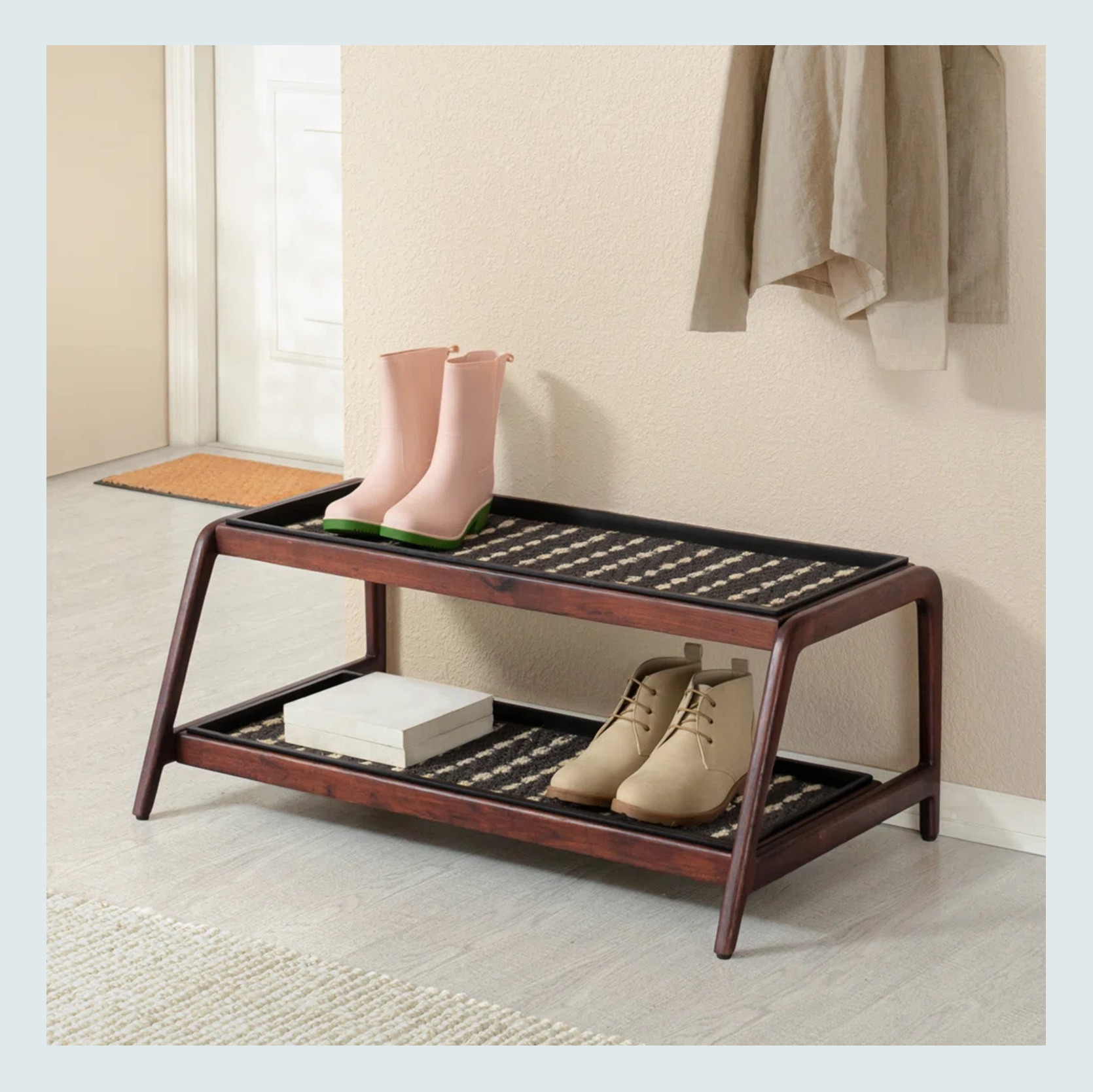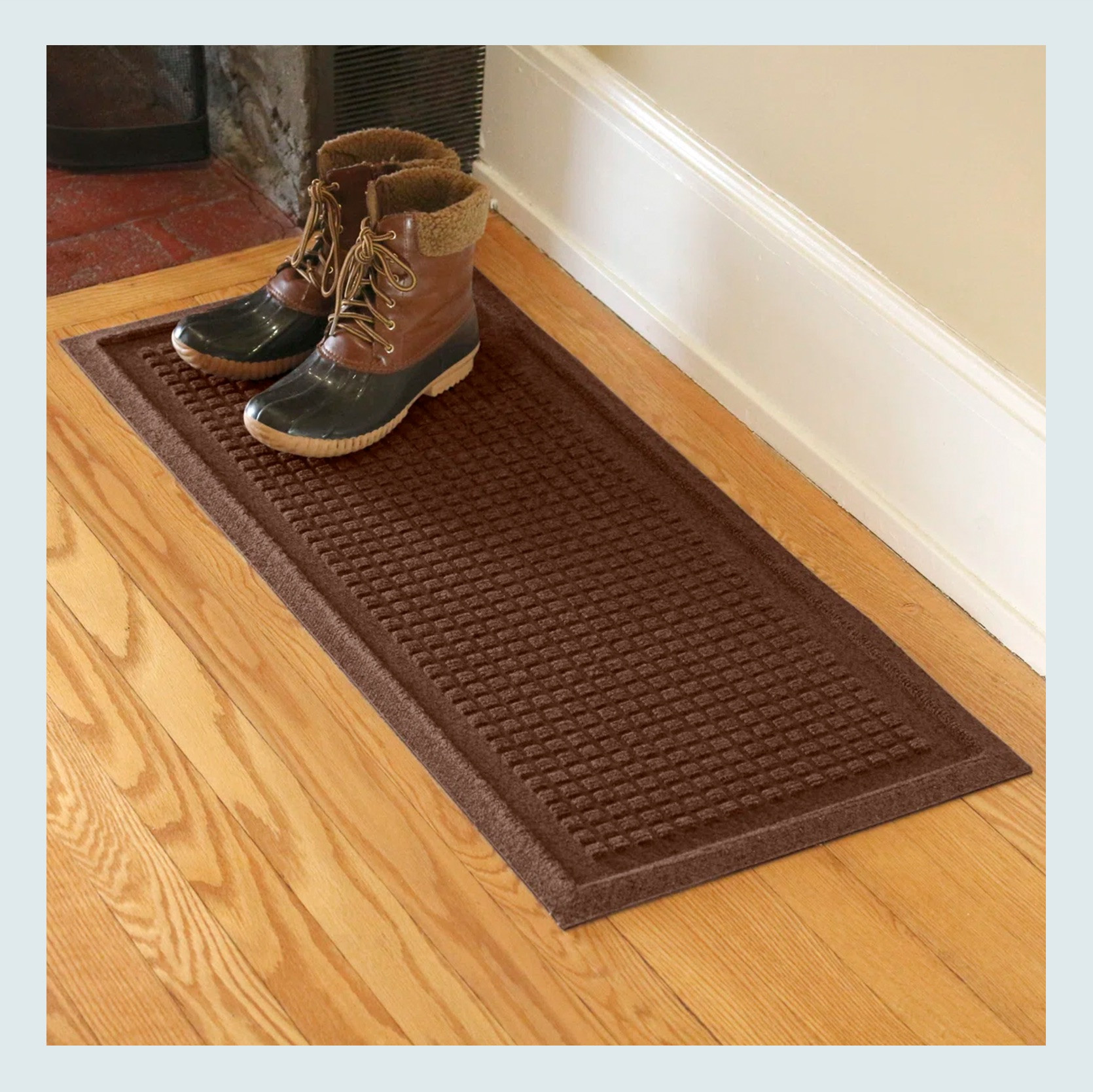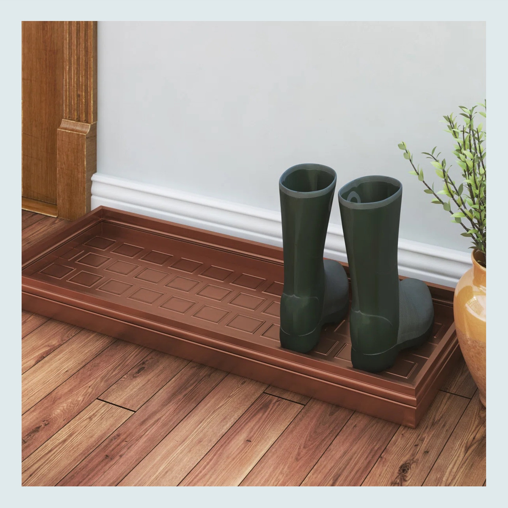 If you need a boot tray, you probably need an indoor weather mat, right? We like ones that are simple, have a nice neutral color, and a subtle pattern. This one is great because it really checks those boxes, and if you read about it, this puppy is durable. This slender size is great too for smaller or more narrower spaces.