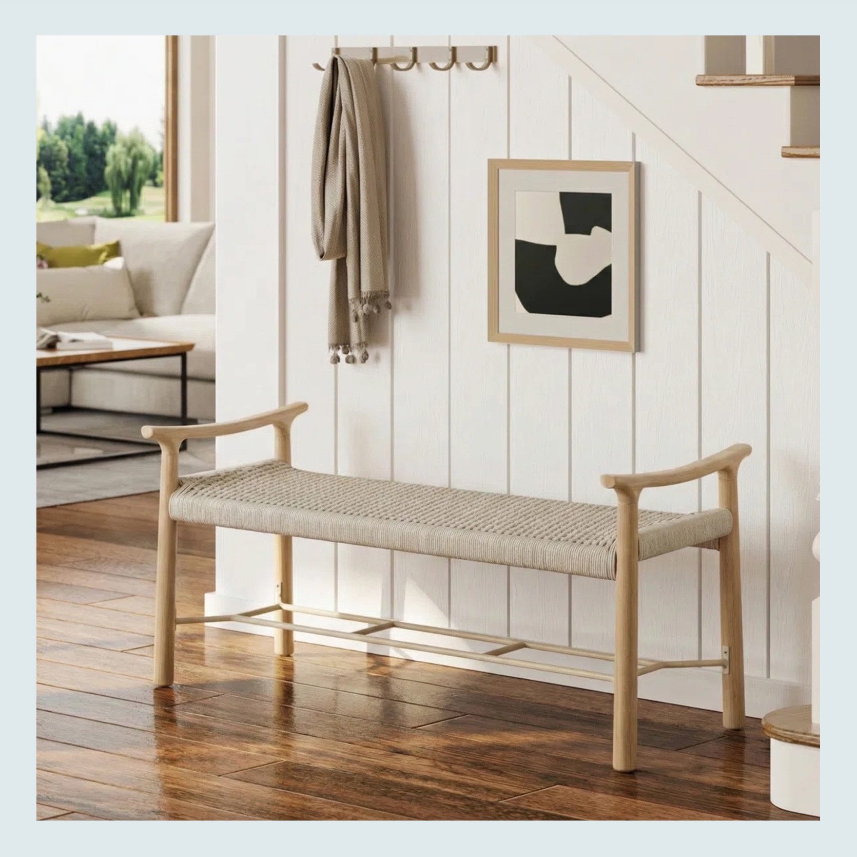 This one I LOVE visually, but clearly it doesn’t have the same storage capacity as the others. I see this one more for the person, couple, family, etc, that doesn’t have a shoe storage problem but does need a bench. Then let’s say if a pair of shoes needs a quick temporary home or if guests come over, then this is a perfect fit. The curves of the arms are so good, too.