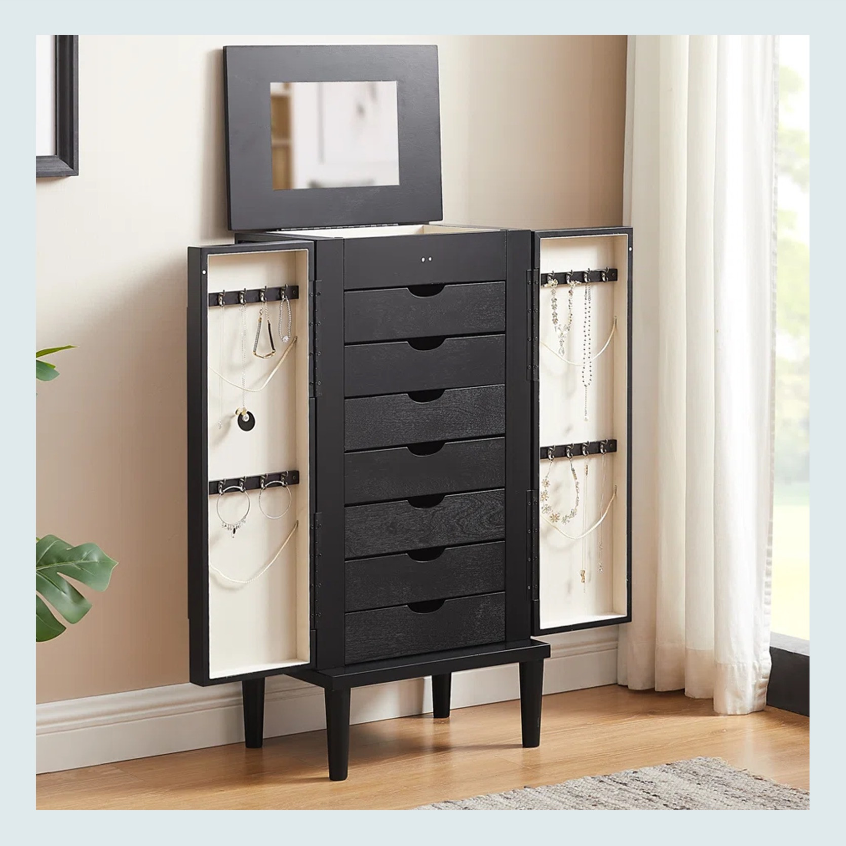 Now this jewelry armoire says to all of these previous options, “hold my beer” when it opens up and reveals SEVEN drawers, two doors for hanging pieces, AND a top compartment with a mirror. I think the next step up from this would be a jewelry closet. It’s simple, stylish, and gives you so much incredible storage!